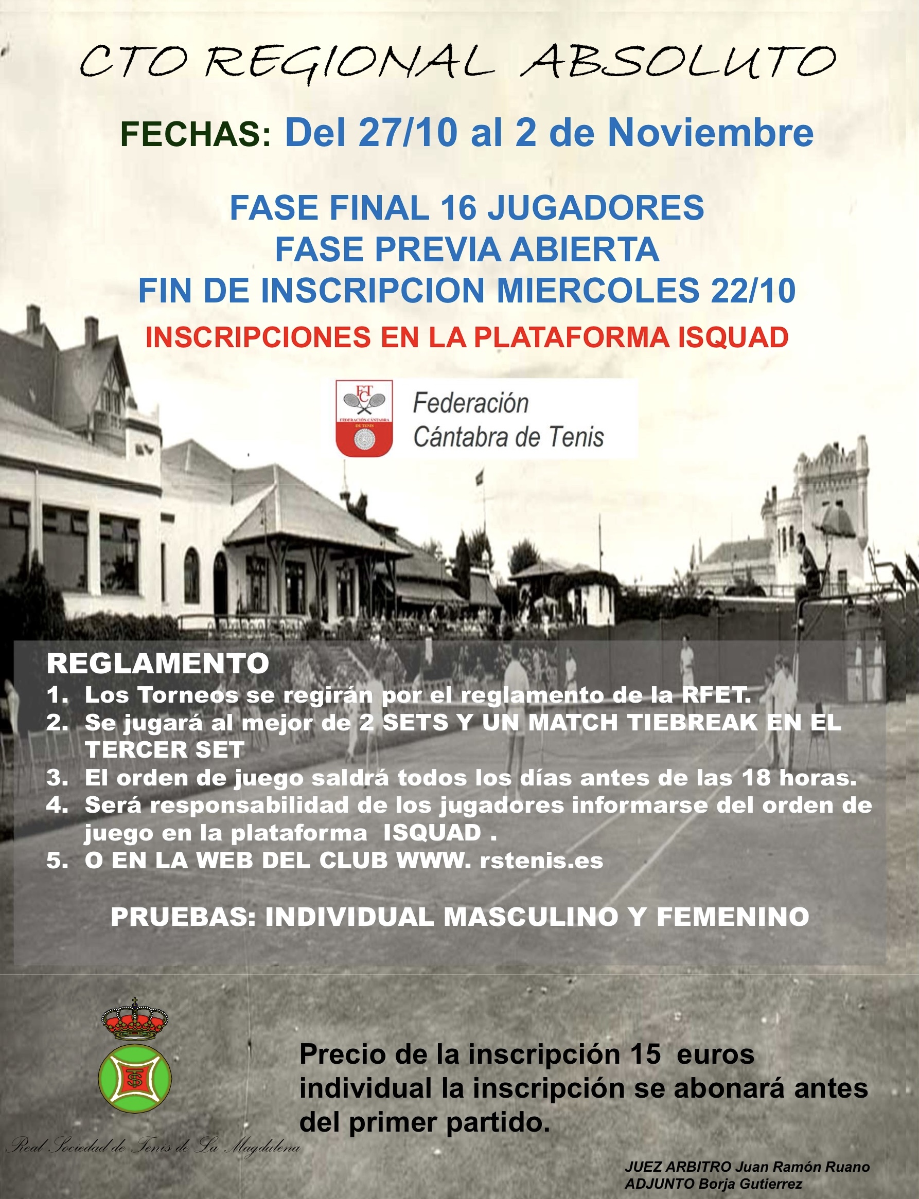 Campeonato Regional Absoluto, del 27 de octubre al 02 de noviembre en R. S. T. Magdalena